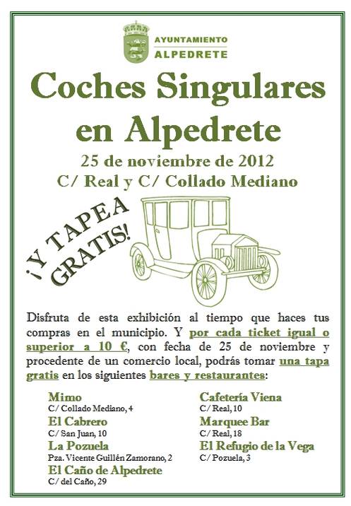 La Concejalía de Desarrollo Local del Ayuntamiento de Alpedrete , en estrecha colaboración con los comercios y restaurantes del municipio, ha organizado una exhibición de vehículos singulares que tendrá lugar el próximo domingo 25 de noviembre por la mañana .