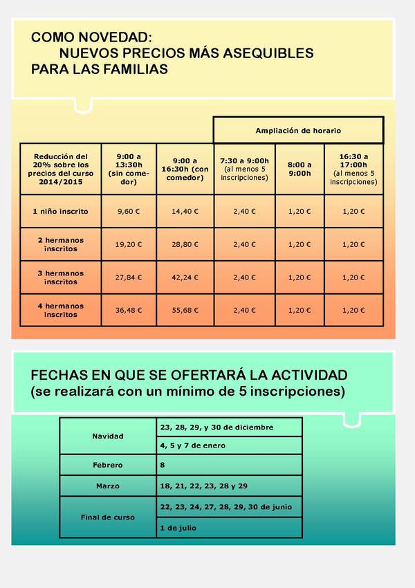 Como novedad, el precio de los días sin cole se verá reducido en un 20%: 9,60 EUR sin comedor y 14,40 con comedor, con descuentos para familias con más de 2 menores inscritos. Además, cada tramo de ampliación horaria conlleva un suplemento de 1,20 EUR.