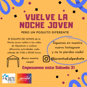 En previsión de que la climatología o las circunstancias no permitan la celebración de alguna de las sesiones, hemos planificado actividades online a través de la nueva cuenta de Instagram que también estrenamos junto a nuevo logo: @juventud.alpedrete , donde semanalmente publicaremos contenidos del área de Juventud y actividades previstas en el programa Noche Joven.